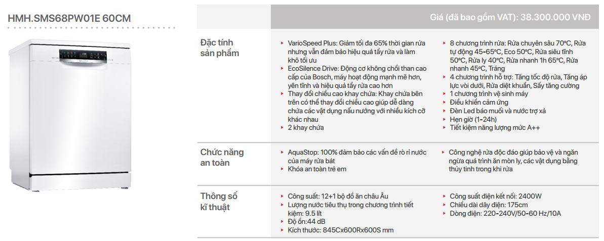 Hệ thống điều khiển động cơ điện tử và nhiều giải pháp giảm tiếng ồn đảm bảo Máy rửa bát độc lập BOSCH HMH.SMS68PW01E hoạt động cực kỳ yên tĩnh với độ ồn ở mức lý tưởng – không ảnh hưởng đến sinh hoạt của gia đình bạn