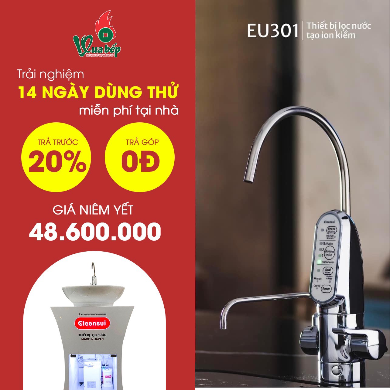 Máy lọc nước Mitsubishi CleanSui EU301 là sự lựa chọn tốt nhất sử dụng công nghệ lọc tạo kiềm và ion hóa nước uống “Alkaline Ionizer”. EU301 được thiết kế dựa trên hệ thống lõi lọc “Super High Grade” độc quyền từ Mitsubishi CleanSui Nhật Bản. Hiện nay mã máy AL700E đã ngừng cung cấp tại thị trường Việt Nam.Khách mua hàng tại website cleansuivn.com sẽ luôn nhận được máy mã mới EU301 và được bảo hành điện tử chính hãng.
